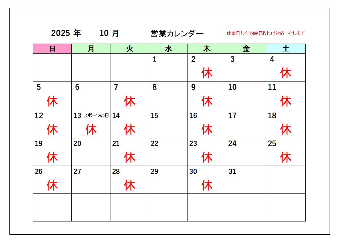 10月の営業カレンダー
